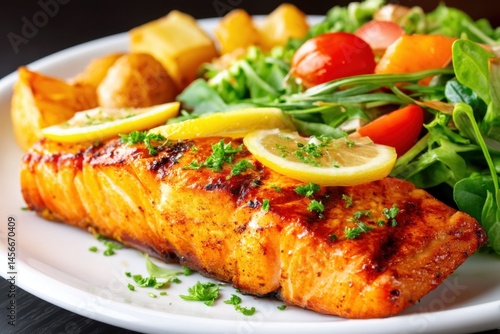 Grilled Salmon with Lemon on a Plate Surrounded by Fresh Vegetables