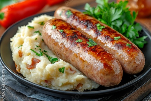 Grilled Sausages, creamy mashed potatoes and fresh parsley. Savory fried sausages and garnish, lunch or dinner. Bratwurst Barbecue. Meat product. Catering. Traditional British dishes, bangers and mash