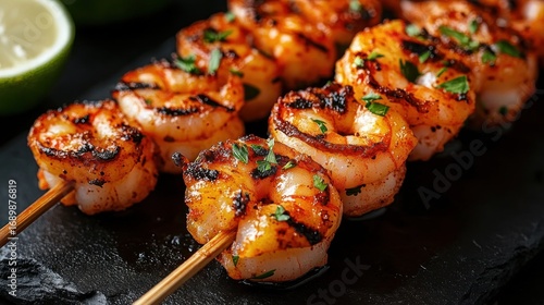 Grilled shrimp skewers garnished with fresh herbs served on a dark slate surface with a wedge of lime