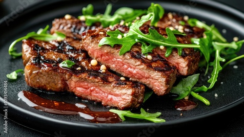 Grilled steak served on a sleek black plate, garnished with fresh greens and a rich sauce for an elegant presentation.