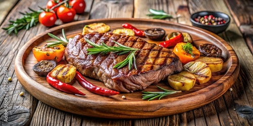 Grilled steak with roasted vegetables on a wooden plate , rustic , wood plate, rustic , wood plate, grilled