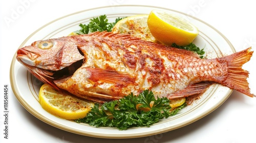 Grilled whole fish garnished with lemon and parsley served on an elegant plate isolated on white background