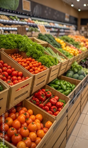 Grocery store filled with various fruits and vegetables in cardboard boxes, with blurred background and lighting.