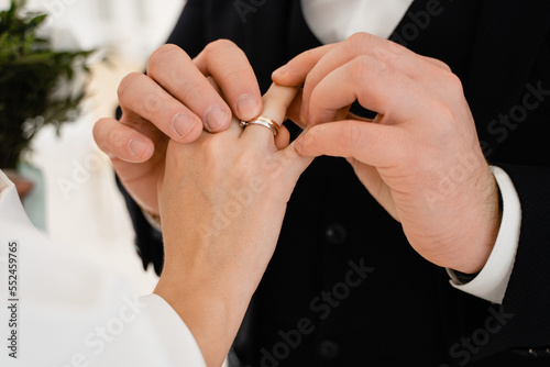 Groom puts wedding ring on top of engagement ring for bride
