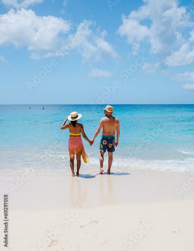 Grote Knip Beach Curacao Island, a Tropical beach on the Caribbean island of Curacao Caribbean. A couple of men and woman on vacation in Curacao walking at the beach