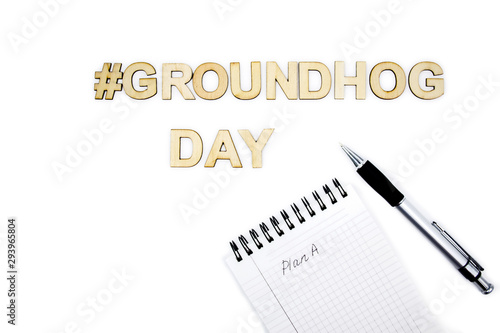 Groundhog day concept with hashtag. Wooden letters and notepad with handwrited 'Plan A' and a pen