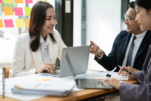 Group of asia business people sitting and talking, meeting, presenting, presenting graphs, chatting happily at the office.