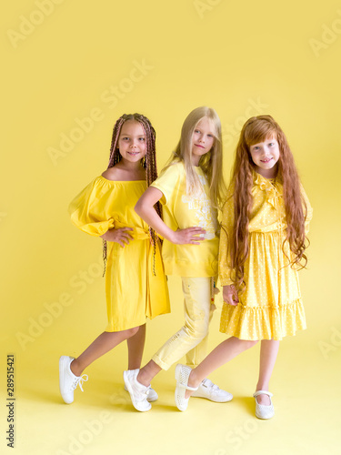 Group of beautiful girls 7 years old in yellow clothes with long hair posing looking at the camera on a yellow background. Children in fashionable stylish clothes. Children's summer clothes