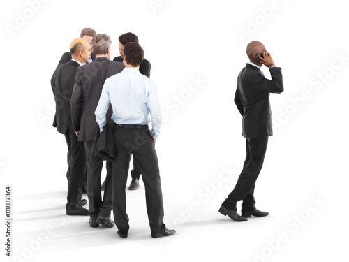 Group of business men with one emerging to the front. Leading the pack, leadership ,performance,initiative or minority concept on a white isolated background. 3d rendering