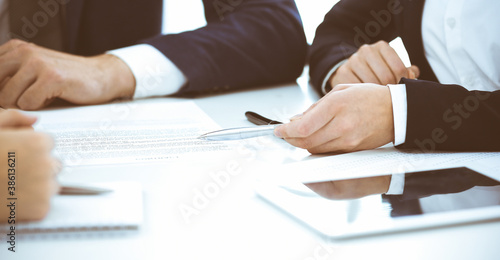 Group of business people and lawyers discussing contract while sitting at the table in office, close-up. Successful teamwork, cooperation and agreement concepts