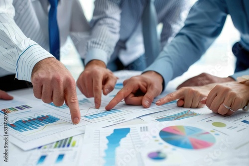 Group of business people working together on new project with planning analytical report at meeting. Businesspeople meeting together pointing to graph assess business profits.