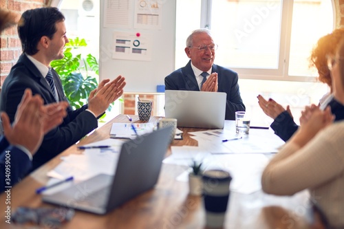 Group of business workers smiling happy and confident in a meeting. Working together looking at presentation using board and laptop applauding at the office.