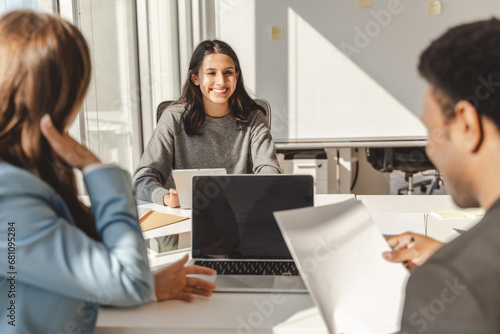 Group of confident businesspeople, smiling middle aged woman talking, brainstorming