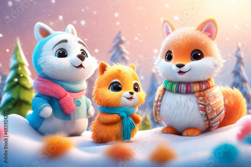 Group of cute funny animal on the background of fabulous winter forest. Cartoon animation character, anime style, 3d illustration.