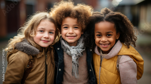 Group of diverse primary school children standing together and looking at the camera, photography.