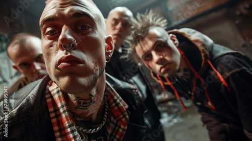 Group of four punk men with intense expressions in a dimly lit urban setting, featuring tattoos and piercings.