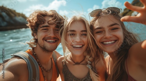 Group of Happy Friends Taking a Selfie on a Sunny Beach Day
