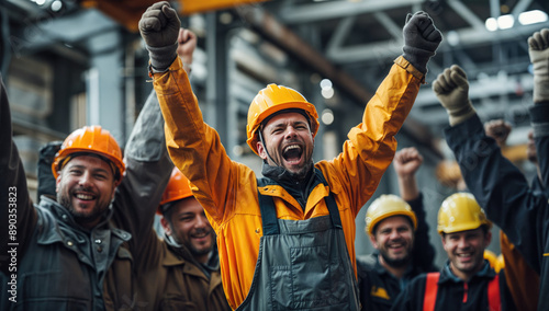 Group of industrial workers celebrating success in metal industry factory