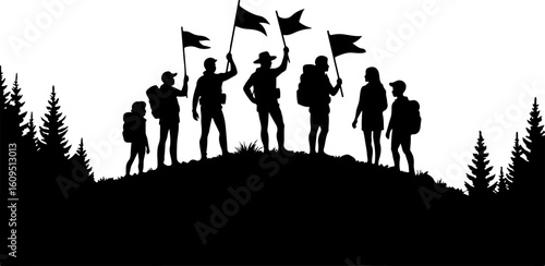 Group of people walking on mountain, people, silhouette, sunset, family, couple, woman, sun, group, men, vector, summer, child, illustration, nature, sky, tree, grass, landscape, walking, love, hiking