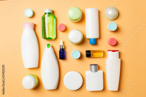 Group of plastic bodycare bottle Flat lay composition with cosmetic products on colored background empty space for you design. Set of White Cosmetic containers, top view with copy space
