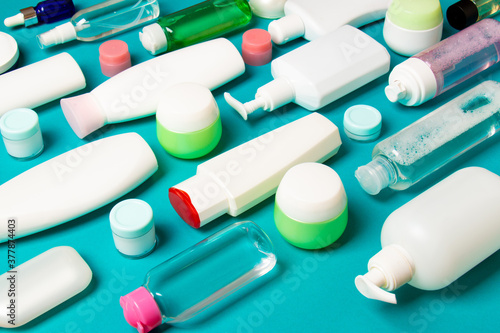 Group of plastic bodycare bottle Flat lay composition with cosmetic products on colored background empty space for you design. Set of White Cosmetic containers, top view with copy space