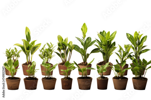 Group of Potted Plants Arranged Neatly. A variety of potted plants of different sizes and species are arranged closely next to each other. The pots are lined up in a row creating a good display.