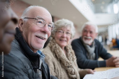 Group of seniors discussing grant benefits with flyers at community center bench, natural light,