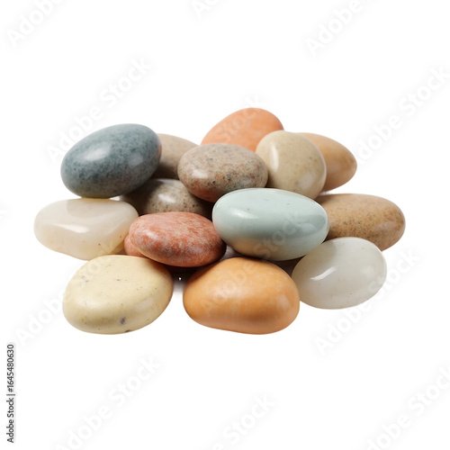 Group of smooth, polished stones in various colors, creating a visually appealing pile, isolated on a white and transparent background