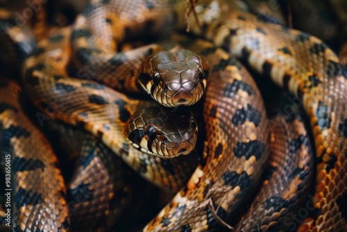 Group of snakes tangled together in a mysterious encounter under the forest canopy during daytime