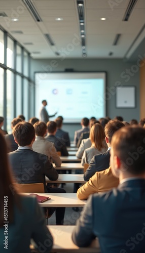 Group of students in modern classroom during lecture. People listen to teacher near whiteboard with presentation. Education, learning in college, university, school, training courses, seminar, pro