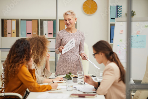 Group of three unrecognizable young women sitting at office table listening to their colleagues presentation at meeting