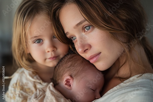 Group portrait of white Caucasian family of three, mother breastfeeding newborn baby, older sibling sister girl standing watching, lifestyle candid real life emotions