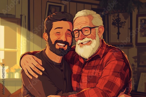 Grown-up hipster son happily hugs an old man at home. Two bearded generations having a relaxed conversation with smiles. 2 men happy Father's day stay home with family love.