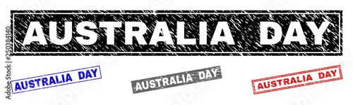 Grunge AUSTRALIA DAY rectangle stamp seals isolated on a white background. Rectangular seals with distress texture in red, blue, black and grey colors.