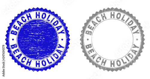 Grunge BEACH HOLIDAY stamp seals isolated on a white background. Rosette seals with grunge texture in blue and grey colors. Vector rubber imitation of BEACH HOLIDAY caption inside round rosette.