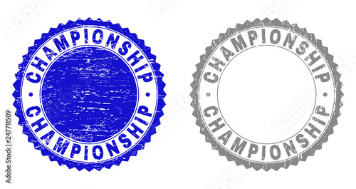 Grunge CHAMPIONSHIP stamp seals isolated on a white background. Rosette seals with grunge texture in blue and gray colors. Vector rubber imprint of CHAMPIONSHIP title inside round rosette.