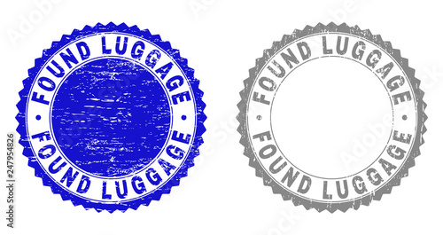 Grunge FOUND LUGGAGE stamp seals isolated on a white background. Rosette seals with grunge texture in blue and gray colors. Vector rubber stamp imitation of FOUND LUGGAGE tag inside round rosette.