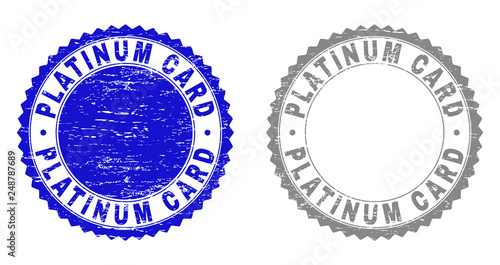 Grunge PLATINUM CARD stamp seals isolated on a white background. Rosette seals with grunge texture in blue and gray colors. Vector rubber stamp imprint of PLATINUM CARD text inside round rosette.