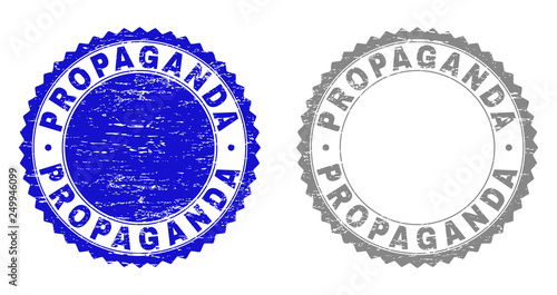 Grunge PROPAGANDA stamp seals isolated on a white background. Rosette seals with grunge texture in blue and gray colors. Vector rubber stamp imprint of PROPAGANDA caption inside round rosette.