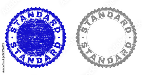 Grunge STANDARD stamp seals isolated on a white background. Rosette seals with grunge texture in blue and grey colors. Vector rubber stamp imprint of STANDARD text inside round rosette.