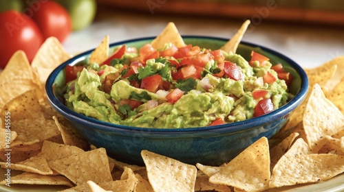 guacamole in a blue-rimmed ceramic bowl, with tortilla chips scattered around, inviting viewers to enjoy this delicious snack
