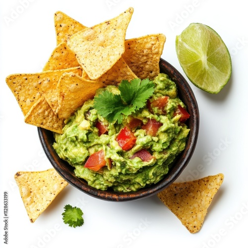 Guacamole with Chips isolated on white background, top view
