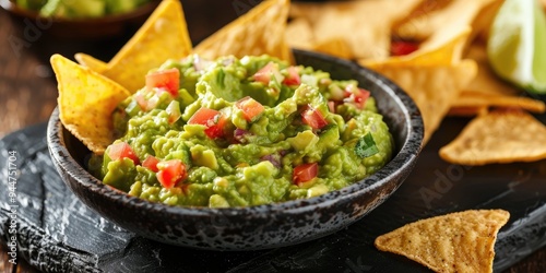 Guacamole with Tortilla Chips or Nachos on a Dark Serving Platter