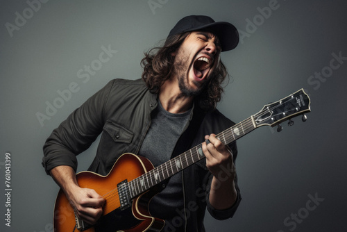 Guitar player screaming while playing an electric guitar on grey background.