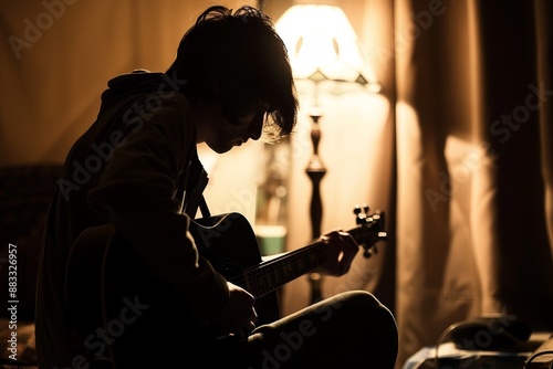 Guitarist Practicing in Dimly Lit Room with Shadows - Artistic High Contrast Photography