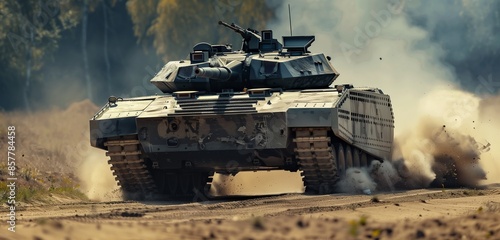 Gunmetal grey armored personnel carrier on a military exercise, space for text on the left.