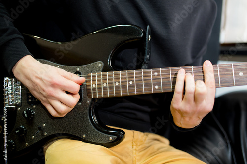 Guy plays guitar close up.