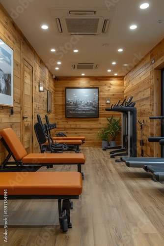 Gym interior featuring wood paneling and equipment.