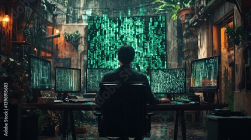 Hacker in a rain-drenched alley