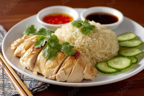 Hainanese Chicken Rice with Poached Chicken Breast and Fragrant Jasmine Rice